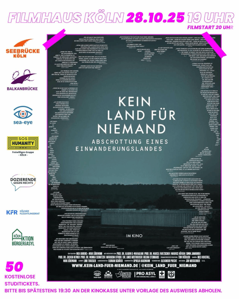 Am 28.10.25 um 20 Uhr zeigen wir gemeinsam mit anderen solidarischen Gruppen aus Köln den Film „Kein Land für Niemand“ im Filmhaus in Köln. Es ging richtig schnell und die regulären Tickets sind alle schon verkauft. ABER für Studis gibt es noch eine großartige Option: es sind 50 kostenlose Tickets an der Abendkasse (ab 19 Uhr), die gegen einen Studiennachweis ausgegeben werden. Kommt also nicht auf den letzten Drücker! Wir freuen uns!